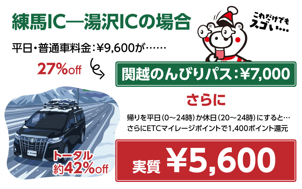 ずらして冬トク!関越のんびりパスは、[E17]関越自動車道沿線へのウィンタースポーツ等を目的としたお出かけに最適な、目的地までの高速道路料金の割引に加えて、混雑を避け、休日の特定の時間帯又は平日に復路をご走行いただくと、通常付与されるETCマイレージサービスのポイントのほかに最大で販売価格の20%のマイレージポイントが付与される割引商品です。https://www.driveplaza.com/etc/drawari/2026_nonbiri_kanetsu/yuzawa.html