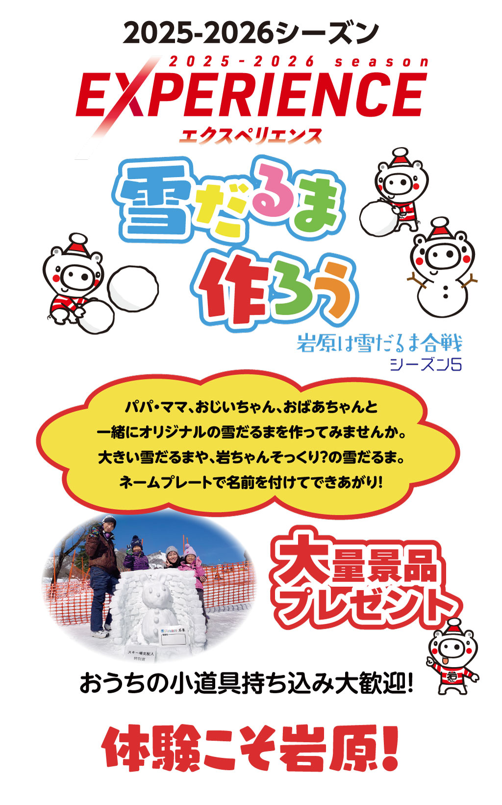 URLをコピーしました! 開催日2026年1月17日(土)・1月31日(土)・2月7日(土)・2月28日(土)・3月7日(土)・3月21日(土)参加費無料 イベント URLをコピーしました! URLをコピーしました! 構想5年!究極の雪上ゲーム「ザ・だるまさんがころんだ」 2025-2026 雪上運動会